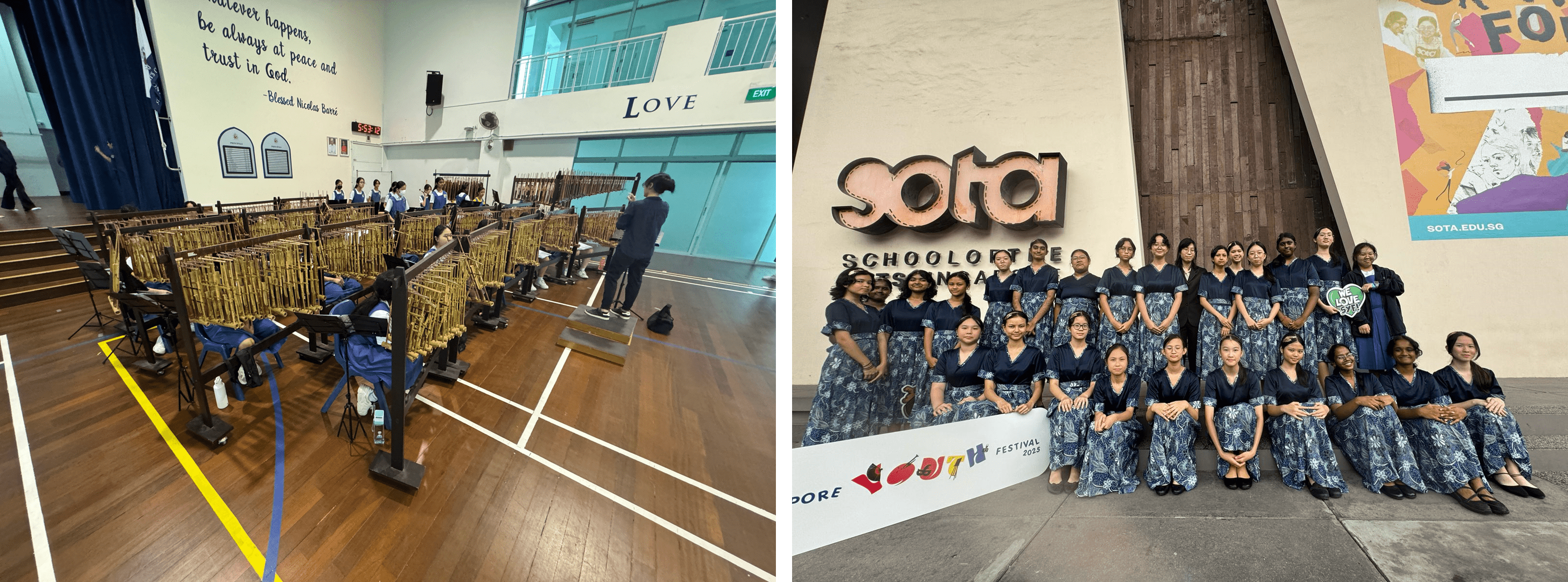 The CHIJ SJC Angklung & Kulintang Ensemble “Plays Together, Shakes as One”. The CCA is made up of a team of young and talented individuals who play a range of instruments, including several angklungs on a rack at the same time, to create harmonic musical pieces.