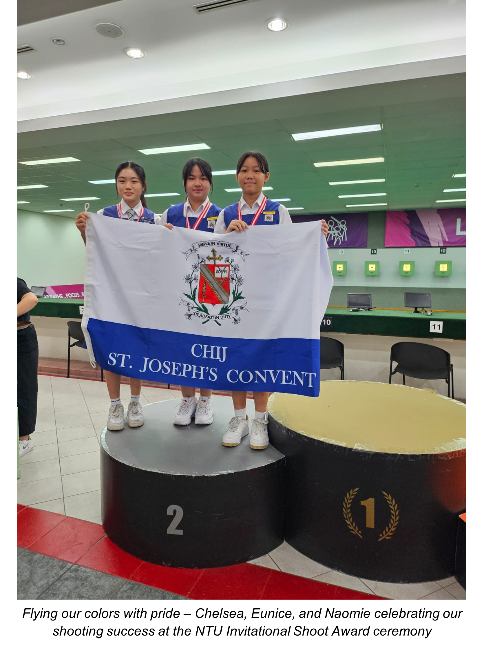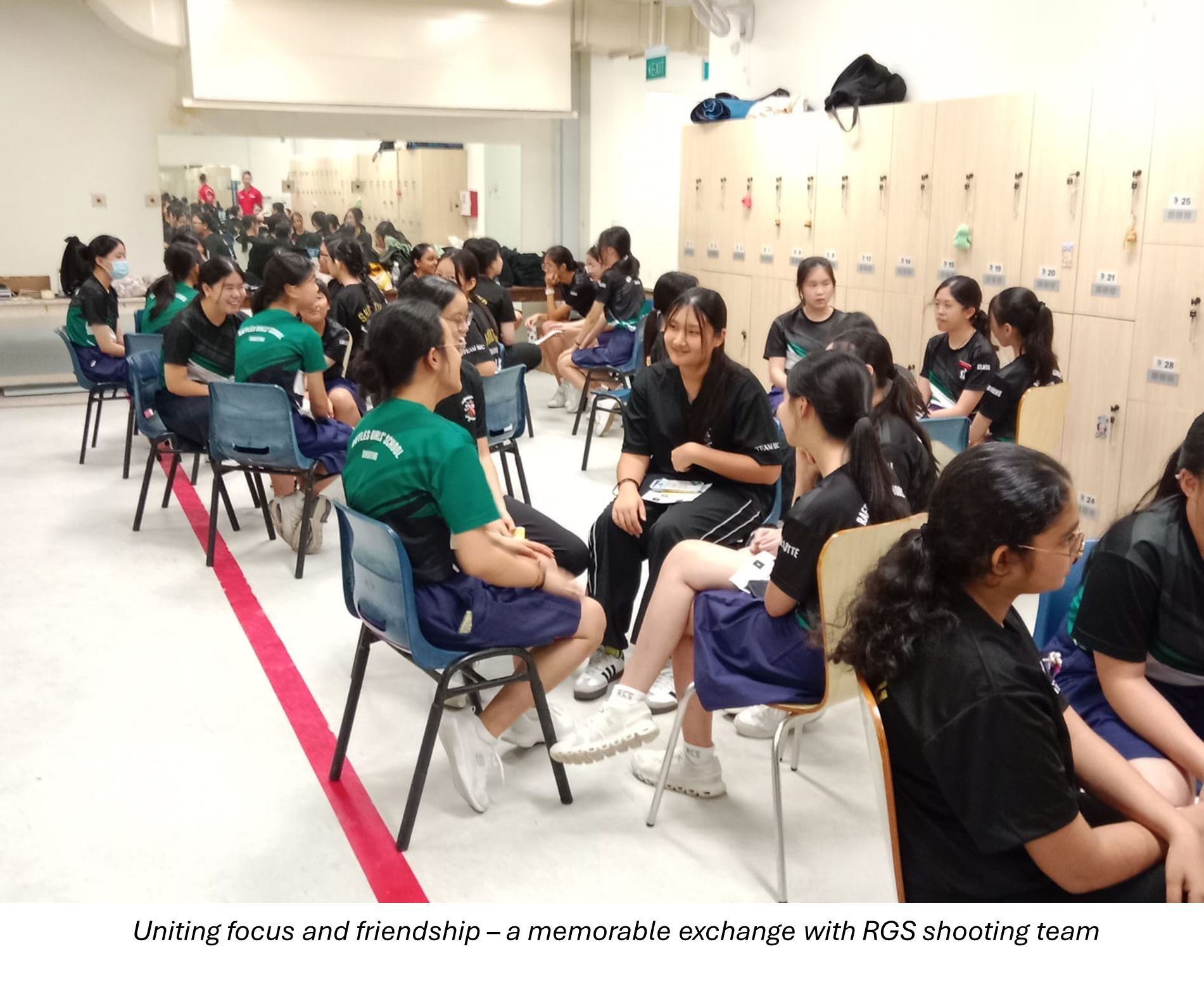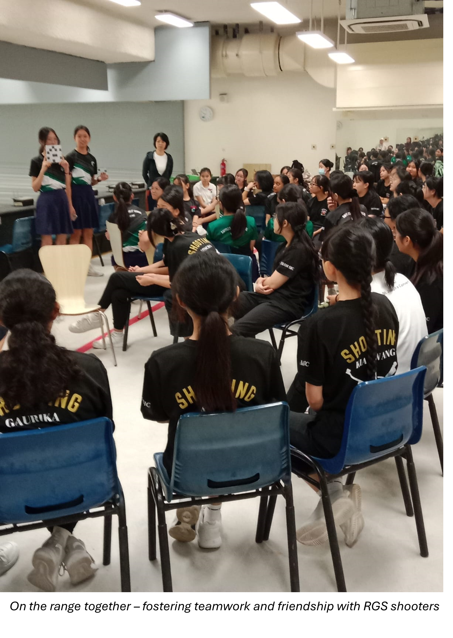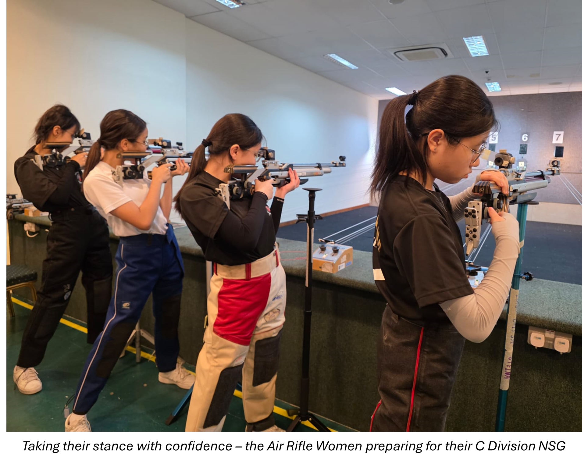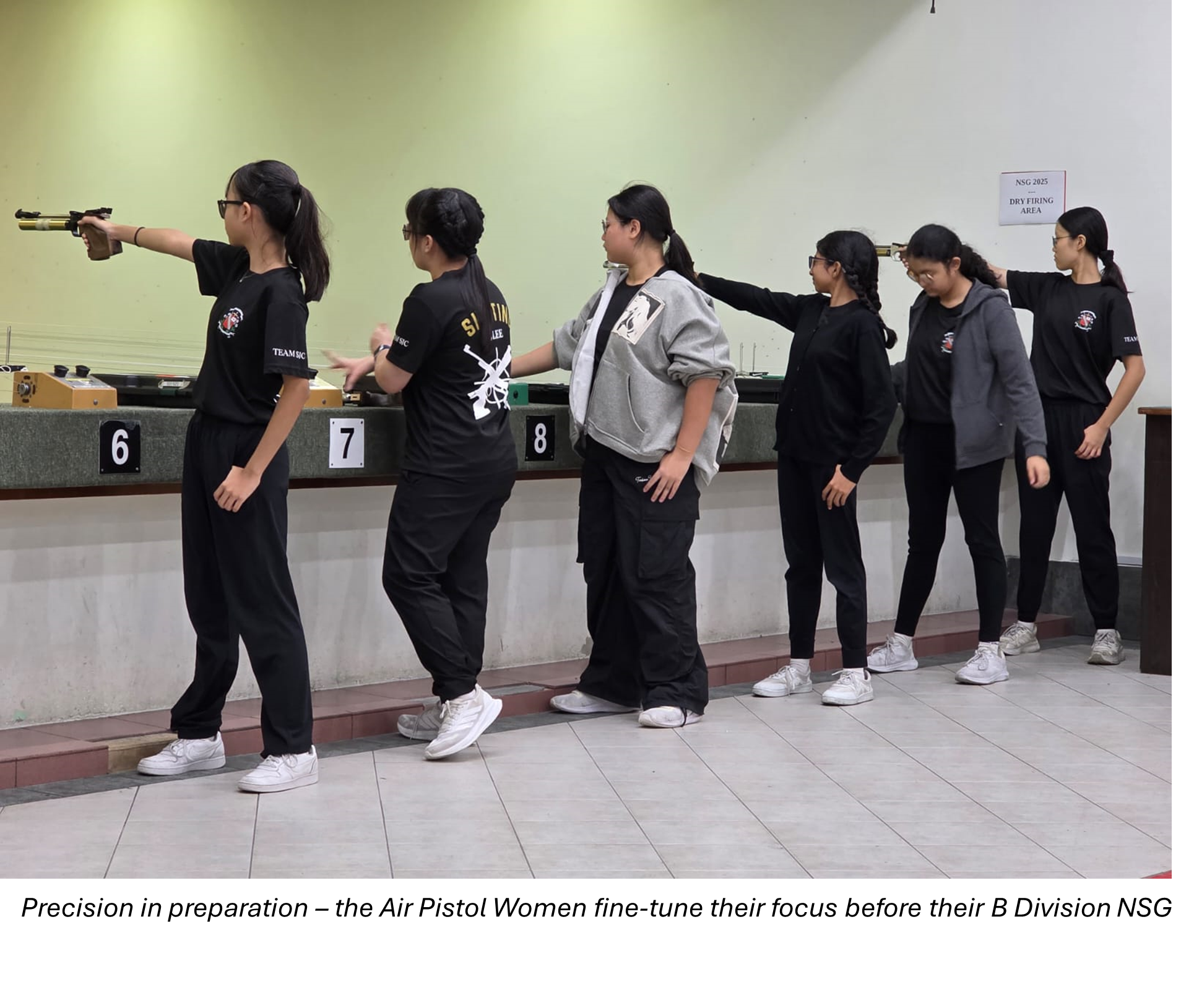 The Shooting Team had an exciting year filled with achievements and camaraderie. Students participated in the NTU and NUS Invitational Shoots, with the B Division Air Pistol Women securing 2nd place at the NTU Shoot, and Eunice Khoo earning first place individually. Our shooters then competed fiercely in the National School Games for both B and C Divisions, where Eunice advanced to the B Division final round. During the June holidays, the team enjoyed a friendly exchange with Raffles Girls Shooting Team at their shooting range, fostering strong bonds and mutual learning. It was a memorable year of skill, teamwork, and friendship for all involved.