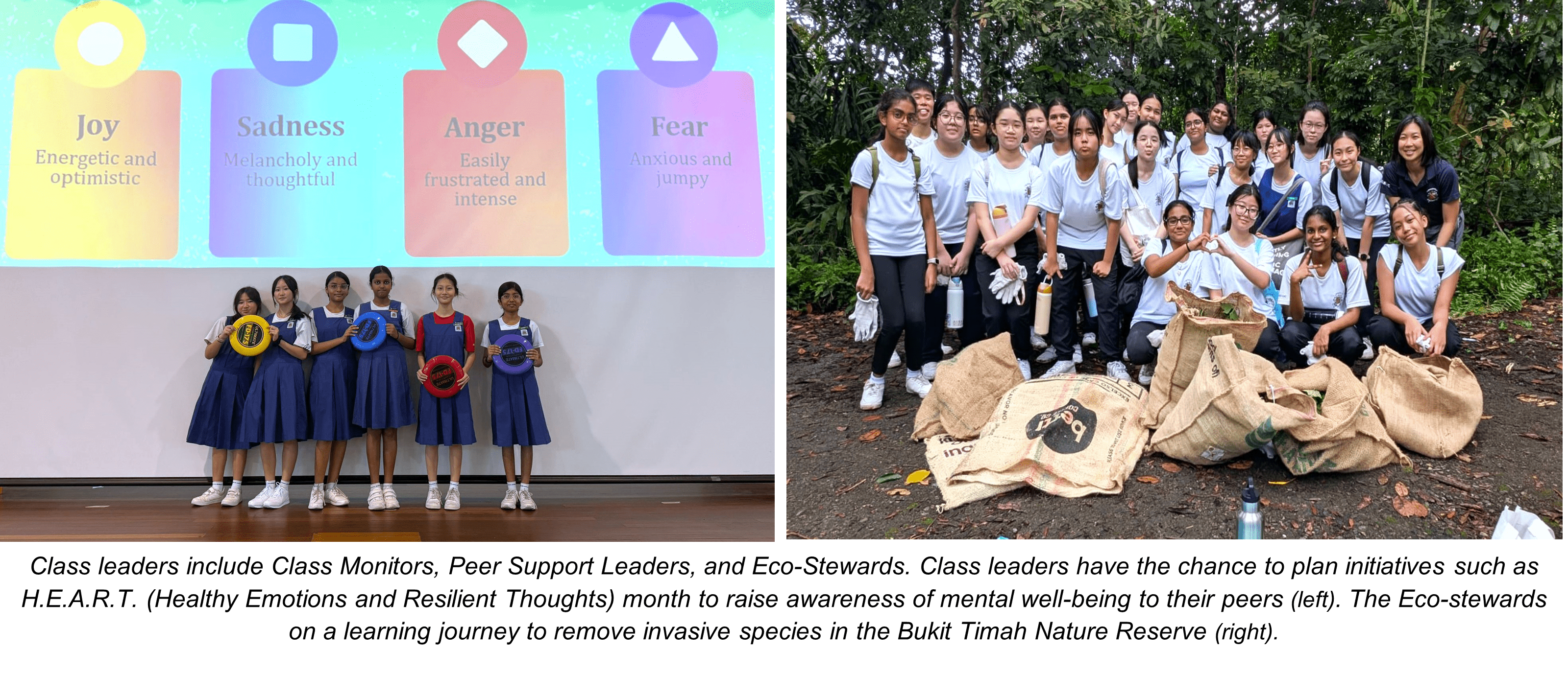Students are empowered to take up leadership opportunities at various levels in schools and we believe all students can be and should be developed as a leader of self to become women of influence. The four main groups of student leaders are Student Council, Sports Leaders, Class Leaders, and CCA leaders. They lead in various school events and engage their classmates in various initiatives, such as enhancing peer support in class to sustainability efforts.