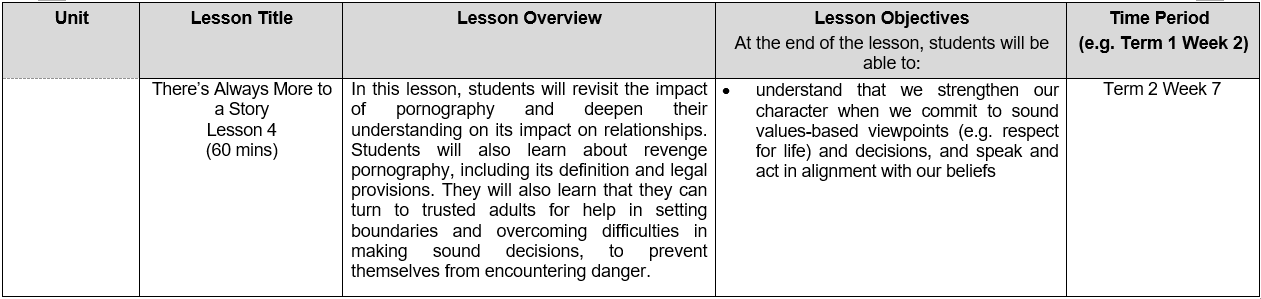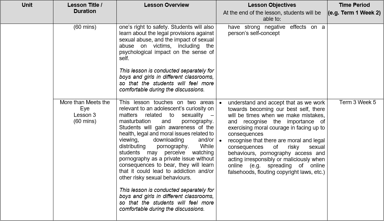 7. Through the Sexuality Education lessons, secondary students will have the opportunity to develop a positive self-esteem, develop their character, and expand their understanding and repertoire of skills to deal with various issues related to sexuality, which are of prime concern at this age.
