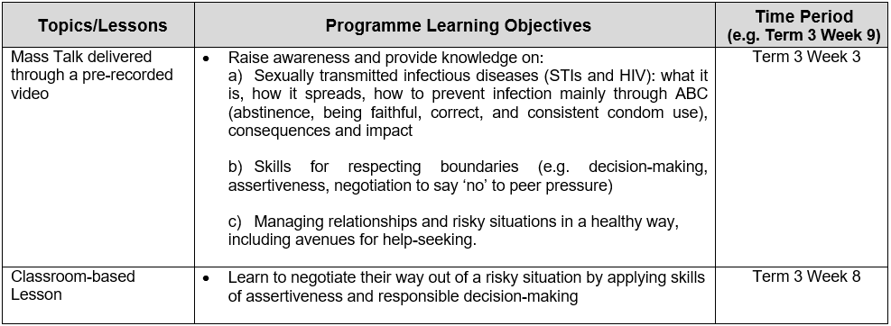 9. Students are taught skills such as decision-making, assertiveness and negotiation to say “no” to sex and negative peer pressure. They also learn that the impact of STIs/HIV extends beyond themselves and involves their family, and the importance of responsible decision-making and seeking help. Abstinence and upholding family values are the key messages.